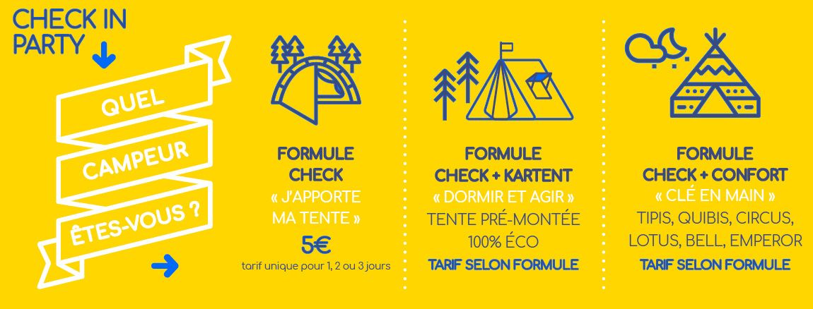 Choisir la formule CHECK & KARKENT, c’est dormir et agir. Solution originale et responsable, KARTENT est une tente destinée aux festivaliers, 100 % recyclable, totalement résistante à l’eau et aux intempéries.